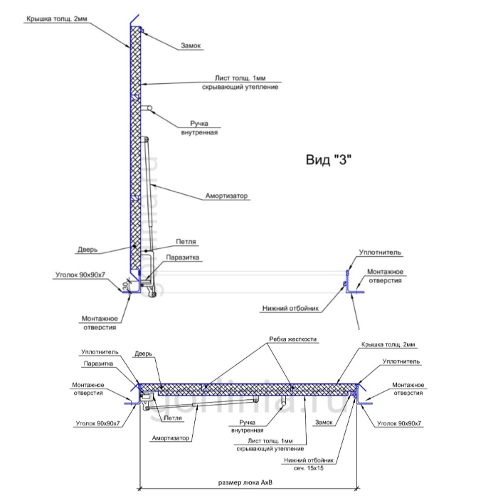 Размер в свету по опорным поверхностям не менее 790х840 в раме без утеплителя из уголка 90х90. Опционно борт можно изготовить из неравнополочного профиля:
