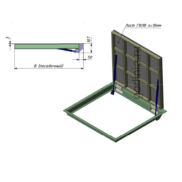 Облегченная модель прямоугольного исполнения без щелей в полу с уведенными за ось открывания петлями. Легкая ходовая часть и удобный монтаж. Комфортный световой проем лаза 750*800 для спуска по лестнице мешков, ящиков, овощей и солений в домашний погреб. При формировании посадочного отверстия обратите внимание, что защитные кожухи шарниров выходят за посадочную отметку по плечевой стороне 900 (см фото).